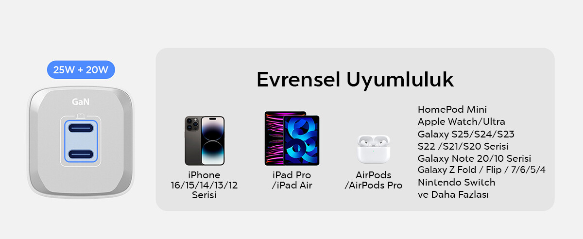 Cihaz Modellerinde Uyumluluk: Akıllı IC Çip Koruma teknolojisi ile Şarj edilen cihazın özelliklerine göre, şarj gücünü optimize bir şekilde ayarlar. Galaxy S25 cihazınızı 60 dakikada %100, iPad Pro 12.9" cihazınızı 60 dakikada %58, iPhone 16 Pro cihazınızı 60 dakikada %82 şarj eder.