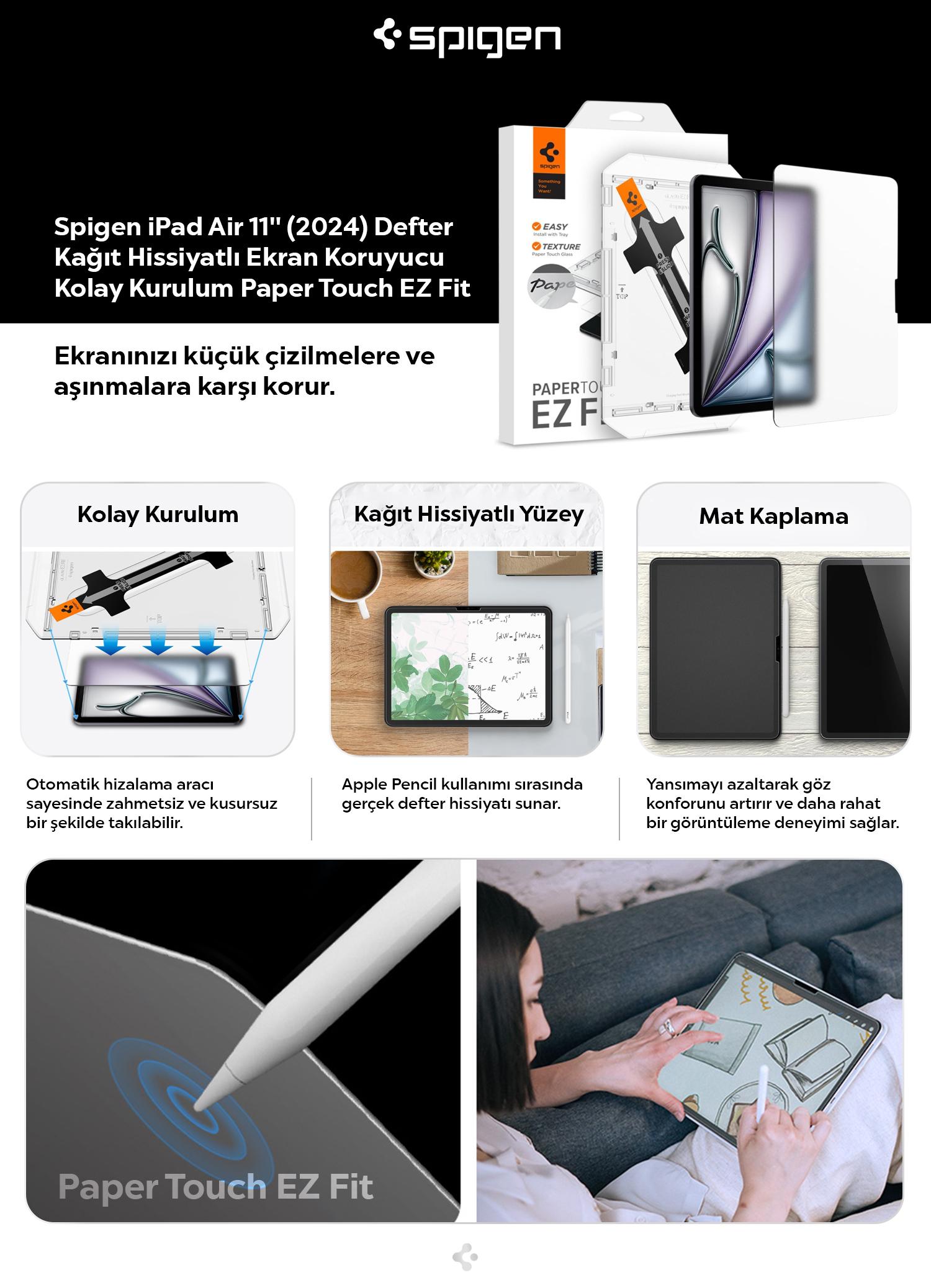 Spigen iPad Air 11" M3 (2025) / M2 (2024) ile Uyumlu Defter Kağıt Hissiyatlı Ekran Koruyucu Kolay Kurulum Paper Touch EZ Fit - AGL07799