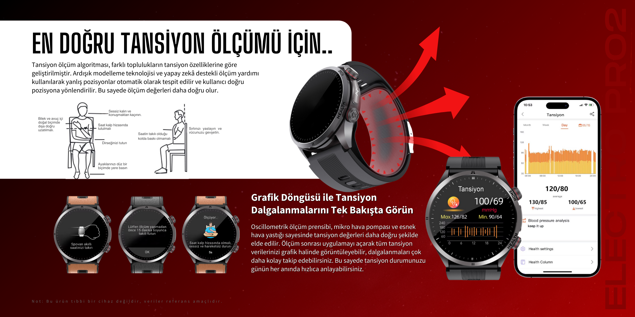 Tansiyon ölçümleri hızlı ya da detaylı olarak seçimleyebilirsiniz. Hem tansiyon aletini kolunuza takıp hem de saatinizi kolunuza takarak ölçüm sağlamayı denemeyiniz. Kolunuzda 2 kanaldan aynı anda basınç sağladığınızda iki cihaz da yanlış ölçüm sağlayacaktır. Saatinizi manyetik bir ürün yakınında bırakmayınız , ölçüm sağlarken konuşmayın ve hareket etmeyin. Frekanslardaki titreşimler cihazın ölçümlerini etkileyecektir. Ölçüm anlık sağlansa da açlık ve tokluk ölçümleri için yediğiniz yiyecek sonrası gıdanın kana karışması ve sol kolunuzdaki bileğinize ulaşma süresi ve saatin analizi yaklaşık 15 dk sonra etkinleşebilir. Tıbbi cihazlardan ölçüm sağlayıp akıllı saatin uygulamasına 1 kez verilerinizi girerek kalibrasyon sağlayabilir ve yapay zekanın sizin vücudunuza daha iyi tanımasına destek olabilirsiniz. Bu sonuçları olumlu olarak etkileyecektir.