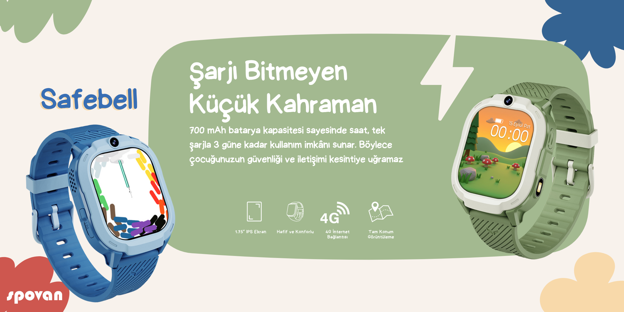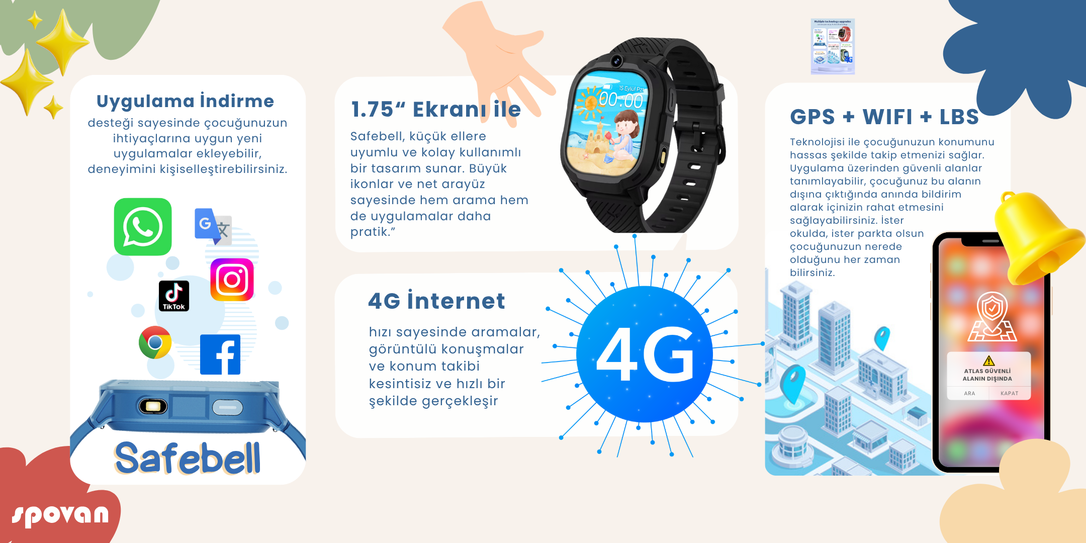 Spovan Safebell Görüntülü Görüşme GPS 4G Güvenli Akıllı Çocuk Saati