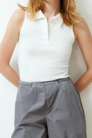 Stil Kadın Düğmeli Sıfır Kol Fitilli Esnek Bluz Regular Örme Slim Kalıp Feminen ve zarif detaylarla tasarlanmış bu kadın bluzu, her kadının gardırobunda bulunması gereken kurtarıcı parçalardan biri.