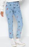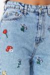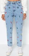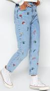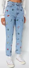 Stil Kadın Moda Denim Kot Pantolon Regular Dar Paça Mavi Nakışlı Yüksek Bel Mom Jeans