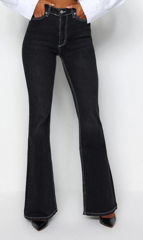Stil Kadın Moda Denim Kot Pantolon Uzun İspanyol Paça Yüksek Bel Jeans