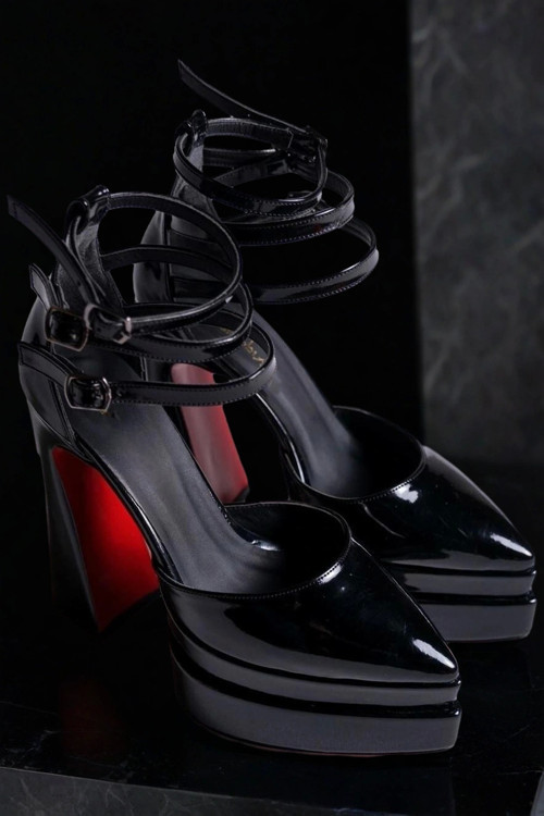 Molly Siyah Rugan Taşlı Fileli Kalın Topuklu Ayakkabı - Image 1