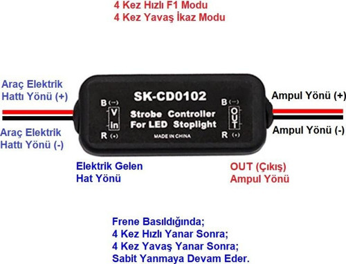Fren Çakar Modül, Aracınız seyir halindeyken frene bastığınızda arkadan gelen araçları daha dikkat çekecek şekilde uyarı vermesidir. 12v uyumludur.