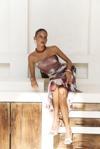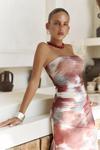 Straplez yaka, drape detaylı mini elbise. Asimetrik ve volanlı etek ucu ile