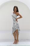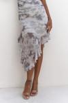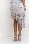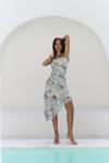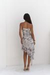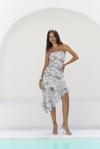 Straplez yaka, drape detaylı mini elbise. Asimetrik ve volanlı etek ucu ile