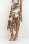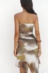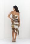 Straplez yaka, drape detaylı mini elbise. Asimetrik ve volanlı etek ucu ile
