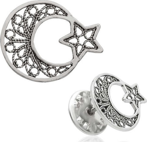 Türk bayrağının ilhamını da kan gölüne yansıyan ay ve yıldızdan aldığını biliyoruz. Bayrağın taşıdığı kutsal anlamı yakanızda ve her anınızda taşımak, sevdiklerinizle paylaşmak için kaçırılmayacak bir fırsat sunuyoruz. Doğum günü hediyesi, babalar günü veya özel günlerde tercih edilebilecek mükemmel bir seçenektir.Bu şık rozet; 925 ayar gümüşten imal edilmiştir. Gümüş üzerine oksit kaplama yapılmıştır. Tüm gümüş rozetlerde olduğu gibi gümüş telkari ay yıldız rozet de tamamı el emeği ile üretilmiştir. Gümüş ve değerli taşlar nedeniyle belirtilen ortalama ürün ağırlığında ± %10 sapma olabilmektedir.