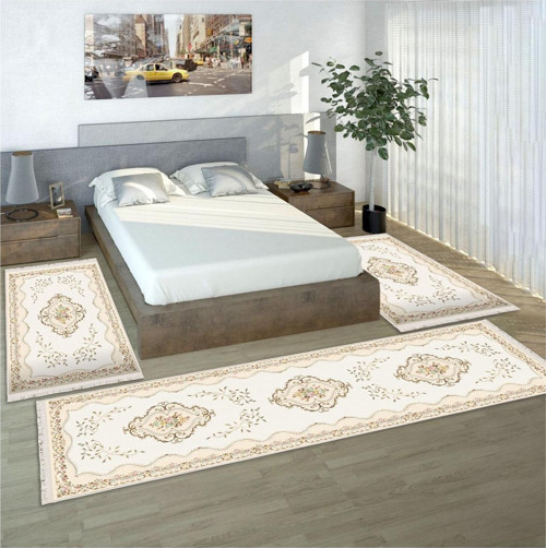 STY Home Krem Çicekli Dijital Baskılı 3 'Lü Yatak Odası Halısı Yolluk Takımı 80X150 2 Adet 80X300 1 Adet 14
