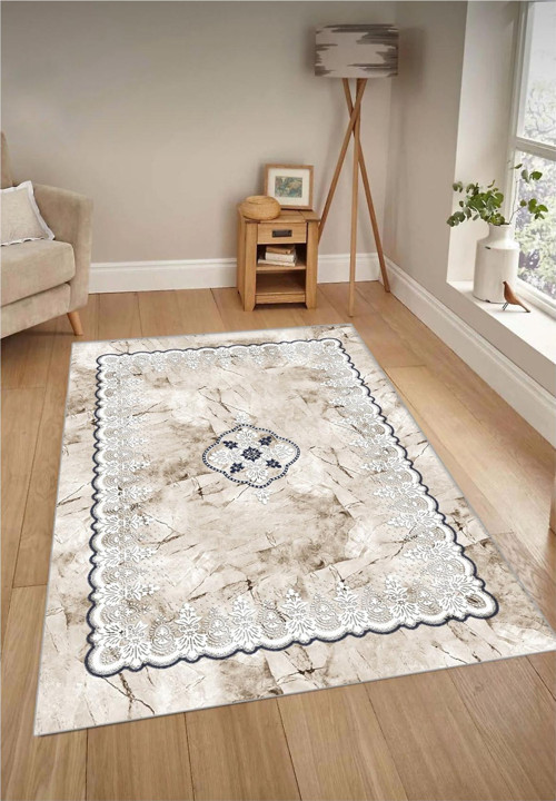 Krem Mavdijital Baskı Kaymaz Tabanlı Yıkanabilir Halı Yolluk Salon Halısı
