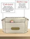 Ekstra bir cep daha kapak altında gizlenmiş durumda.. İç kısmında ise fermuarlı ayrıştırma cebi, 2 adet biberon sabitleme lastiği ve hem omuz askısı hem de bebek arabası askı aparatı için çift halka bulunuyor..
