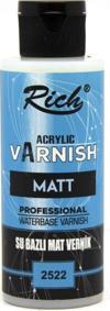 Rich Su Bazlı Mat Vernik 120cc,rich su bazlı vernik dekorasyon ve sanatsal hobi çalışmalarında kullanılan su bazlı kokusuz verniklerdir. Sağlığa hiçbir zararı olmayan yüksek kalitesiyle darbelere silinmelere sürtünmelere karşı oldukça dayanıklıdır. Ahşap, cam, seramik, mdf, tuval ve polyester gibi farklı yüzeylerin haricinde özel yapısı sebebi ile varak üzerinde bile uygulanabilir. Kıvamından dolayı fırça izi ve karartma yapmaz. Su ile inceltmeyiniz.