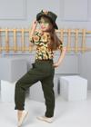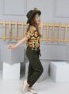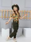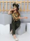 Kolsuz omuzdan lastikli , pantolonunda üst kumaştan kemer ile modellenmiş şapkası ile birlikte 3 parçadan oluşan kız çocuk takım