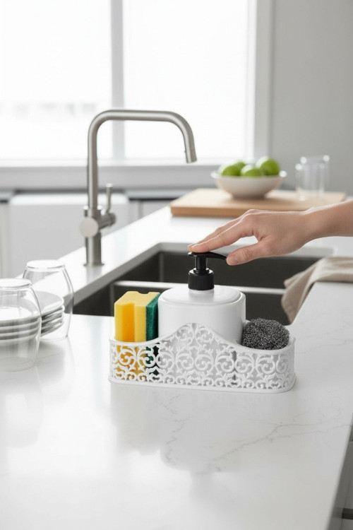 Pompalı haznesi sıvı sabun veya bulaşık deterjanı için ideal kullanım sağlarken, 2 ayrı süngerlik bölmesi sayesinde temizlik ürünleriniz her zaman elinizin altında olur. Dayanıklı plastik yapısı uzun süreli kullanım sunar.