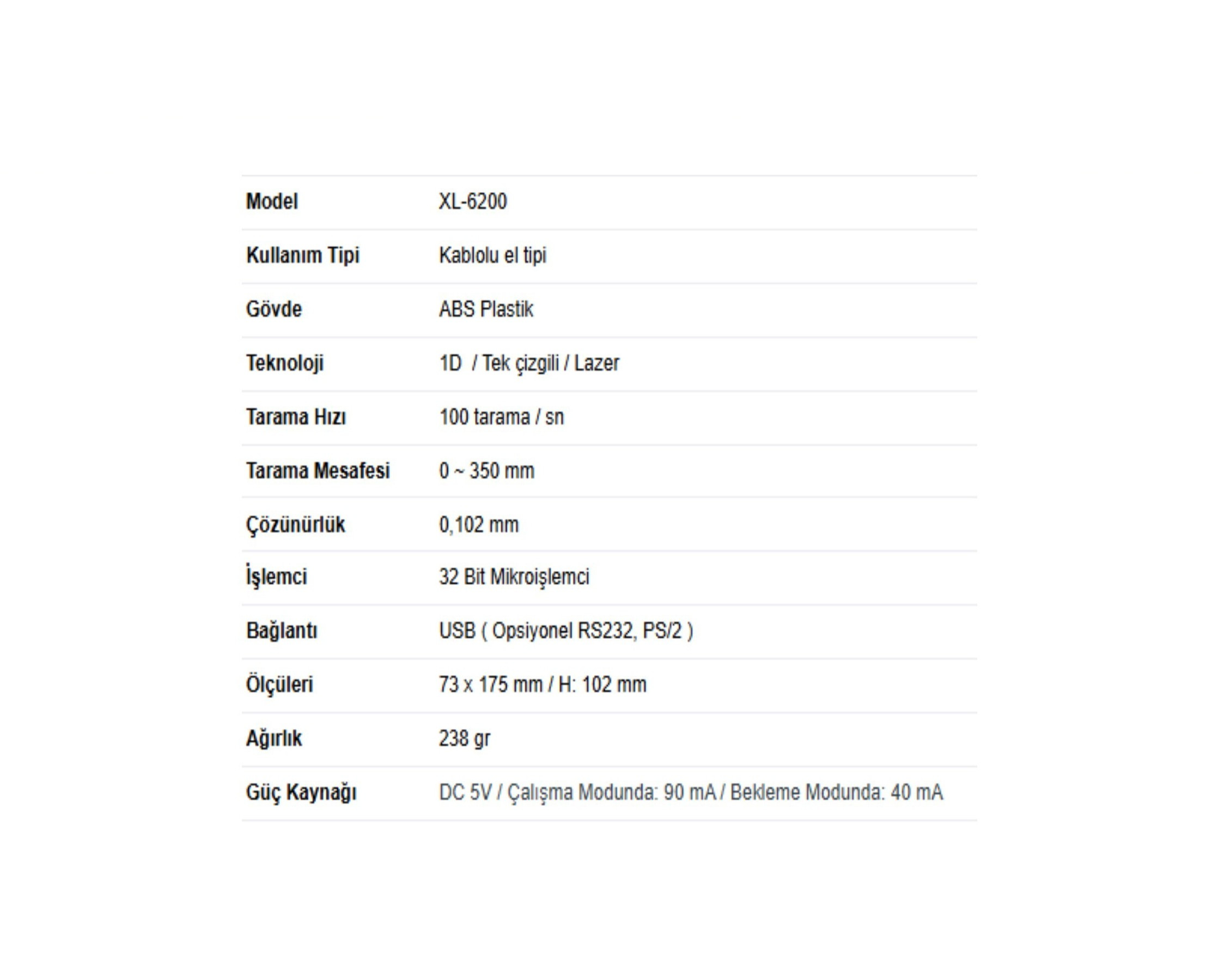 Sunlux XL-6200 el tipi lazer barkod okuyucu, bilgisayarlı bilgi sistemleri için doğru, kolay ve hızlı bir veri girişi ve veri depolama yöntemi sağlar. XL-6200, kızılötesi otomatik sensor teknolojisine sahiptir. Kullanıcının tek yapması gereken, barkodu pencerenin önündeki algılama alanına yerleştirmektir. 650 nm lazer otomatik olarak etkinleştirilir. Ardından, taranması gereken barkoda doğrultulan tarayıcı otomatik olarak tarar ve bilgiler ana bilgisayar sistemine iletilir. Bu ürün için iki mod vardır. Elde taşınabilir ve otomatik algılamalı lazer barkod tarayıcı. Bu, kullanıcının cihazı elde taşınabilir modda veya braketle sabitleme olarak kullanabileceği anlamına gelir. XL-6200, herhangi bir ana bilgisayar sistemine entegre edilebilir.