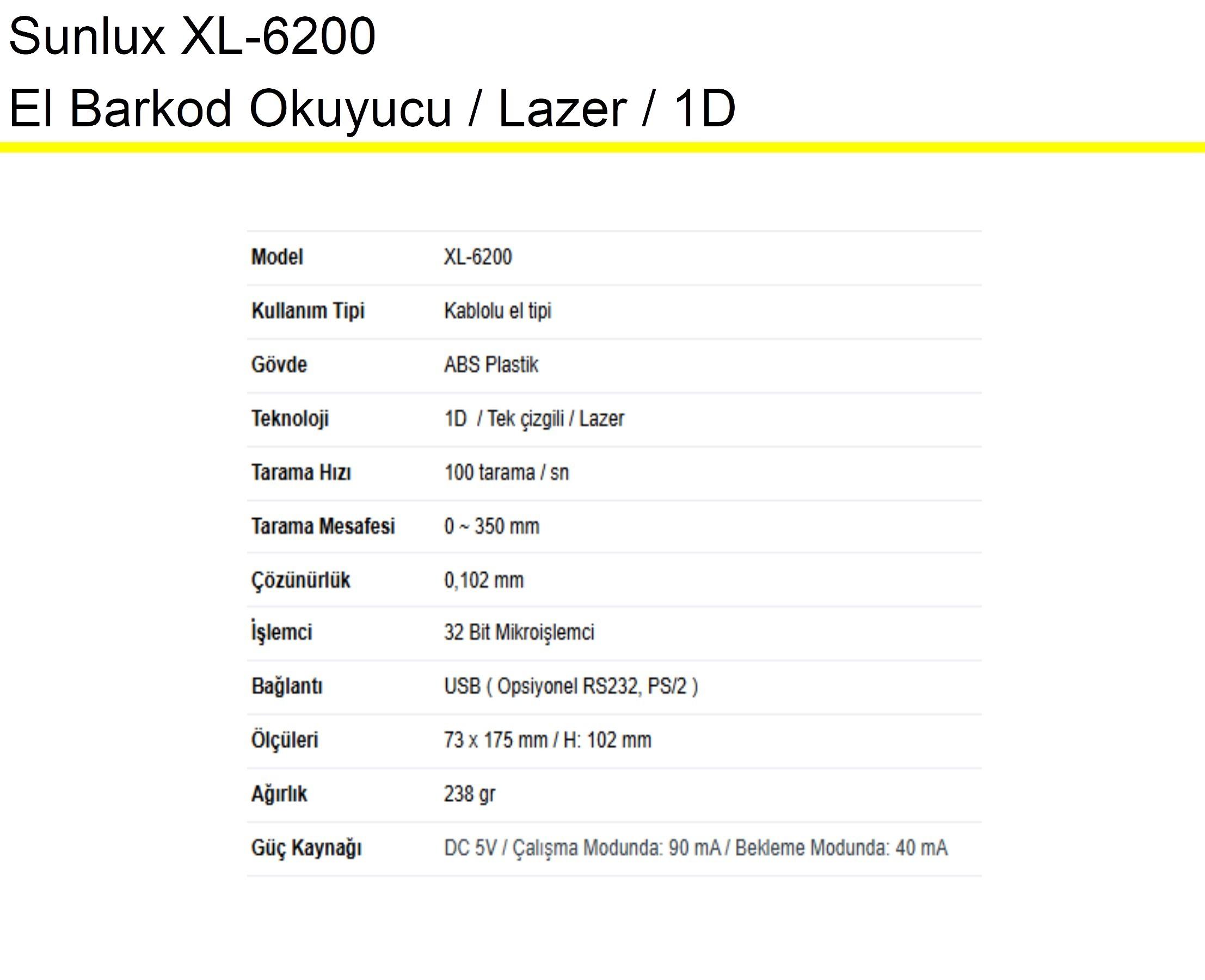 Sunlux XL-6200 el tipi lazer barkod okuyucu, bilgisayarlı bilgi sistemleri için doğru, kolay ve hızlı bir veri girişi ve veri depolama yöntemi sağlar. XL-6200, kızılötesi otomatik sensor teknolojisine sahiptir. Kullanıcının tek yapması gereken, barkodu pencerenin önündeki algılama alanına yerleştirmektir. 650 nm lazer otomatik olarak etkinleştirilir. Ardından, taranması gereken barkoda doğrultulan tarayıcı otomatik olarak tarar ve bilgiler ana bilgisayar sistemine iletilir. Bu ürün için iki mod vardır. Elde taşınabilir ve otomatik algılamalı lazer barkod tarayıcı. Bu, kullanıcının cihazı elde taşınabilir modda veya braketle sabitleme olarak kullanabileceği anlamına gelir. XL-6200, herhangi bir ana bilgisayar sistemine entegre edilebilir.