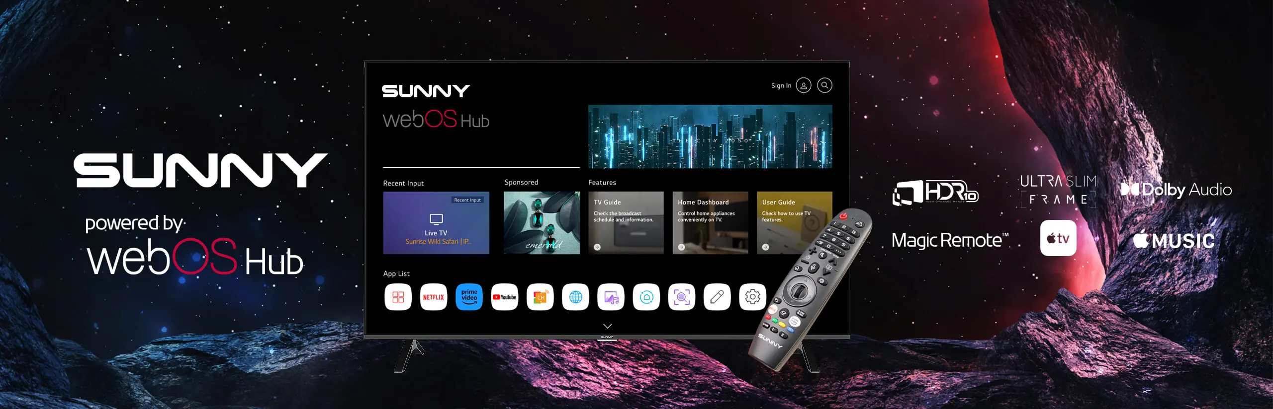 SUNNY Powered by webOS televizyonlarda herhangi bir harici dinleme cihazı olmadan, ses tanıma sistemi için ThinkQ Al teknolojisini kullanabilirsiniz. Sesli komutu uzaktan kumandınız ya da LG Thinq uygulaması indirilmiş cep telefonunuz ile akıllı ev aletlerinizi kontrol etmek amaçlı kullanabilir, aileniz ve arkadaşlarınızla konuşur gibi sesli komut uygulamasını kumandanız ile rahatça kullanabilirsiniz..