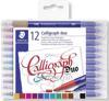 Etkileyici yazı ve dekoratif tasarımlar için idealdir. Bu set çeşitli renklerde 12 çift uçlu kaligrafi kalemi içerir. Dar ve geniş vuruşlar için iki uca sahiptir. Bir tarafı 2.0mm kalınlığında, diğer tarafı 3.5mm kalınlığındadır.