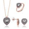 Kalp deseniyle aşkı ifade eden kalpli set modeli ile sevginiz, sevdiğiniz kadının teninde hayat bulsun. Genç sevgililerin ve kendini genç hissedenlerin özel günlerde seçebileceği bu kalpli bayan set ile sevdiğinizi aşkla süsleyin. Sizin olduğu kadar sevdiklerinizin de keyifle takacağı kalp desenli set sevdiğinize en güzel hediyelerden biri olacaktır. Kalpli bayan set 925 ayar gümüşten imal edilmiştir. Gümüş üzerine rose kaplama yapılmıştır.Rose kaplama yapılan gümüş bayan kalpli set modelleri parlaklığını uzun süre muhafaza eder, gümüşü pembe renge çevirir ve oksitlenmesi gecikir. Set üzerinde bulunan taşlar zirkondur. Gümüş olan zincir boyu ortalama 45 cm"dir. Tüm bayan setlerde olduğu gibi gümüş kalpli bayan set de el emeği ile üretilmiştir. Gümüş ve değerli taşlar nedeniyle belirtilen ortalama ürün ağırlığında ± %10 sapma olabilmektedir.