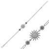 Güneş; ışığın, bilginin, iyiliğin, gücün ve yönetimin sembolüdür. Bu ışıl ışıl ve farklı tasarımıyla göz kamaştıran bileklik; 925 ayar gümüşten imal edilmiştir . Gümüş üzerine rodyum kaplama yapılmıştır. Rodyum kaplama yapılan gümüş ürünler parlaklığını uzun süre muhafaza eder, oksitlenmesi gecikir. Gümüş beyaz taşlı nazarlı güneş bayan bilekliğin üzerinde bulunan taşlar zirkon"dur. Tüm gümüş bileklikler de olduğu gibi gümüş beyaz taşlı güneş bayan bileklik de tamamı el emeği ile üretilmiştir. Ürünlerimizin tamamı el emeği ile üretilmiştir. Gümüş ve değerli taşlar nedeniyle belirtilen ortalama ürün ağırlığında ± %10 sapma olabilmektedir.