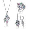 Kalbimizin ve ruhumuzun en eğlenceli tarafı olan rengarenk hayal dünyamızın yansıması özel tasarım renkli setler... Bu şık set; doğum günü hediyesi, sevgililer günü hediyesi veya annelere hediye olarak özel günlerde tercih edilebilecek mükemmel bir seçenektir. Renkli bayan set 925 ayar gümüşten üretilmiştir. Gümüş setin zincir uzunluğu 45 cm’dir. Gümüş üzerine rodyum kaplama yapılmıştır. Rodyum kaplama yapılan bayan setler parlaklığını uzun süre muhafaza eder ve oksitlenmeyi geciktirir. Tüm gümüş setlerde olduğu gibi gümüş renkli bayan set de el emeği ile üretilmiştir. Gümüş ve değerli taşlar nedeniyle belirtilen ortalama ürün ağırlığında ± %10 sapma olabilmektedir.