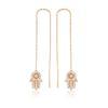 Her ne kadar Hz. Fatma"nın eli olarak bilinse de arapçada “hamse” diye anılır. Hamse, beş anlamına gelir ve bir elin parmak sayısını gösterir. Hz. Fatma bir gün mutfakta helva kavururken, eşi Hz. Ali görür ve pişen helvaya elini daldırır ancak hiçbir şey olmaz, helvayı böyle kavurmayı devam eder. O günden sonra elinin kutsallığına, gücüne adeta yenilmezliğine inanılır. Her güçlük adeta onun eliyle aşılacaktır. Bu eşsiz küpe; doğum günü hediyesi, sevgililer günü hediyesi veya annelere hediye olarak özel günlerde tercih edilebilecek mükemmel bir seçenektir. Bu harika tasarım Fatma eli bayan bayan küpe; 925 ayar gümüşten imal edilmiştir. Gümüş üzerine rose kaplama yapılmıştır. Rose altın kaplama yapılan tüm gümüş küpe modelleri parlaklığını uzun süre muhafaza eder, gümüşü pembe rengine çevirir, oksitlenmeyi geciktirir Küpe üzerinde bulunan beyaz taşlar zirkondur. Tüm gümüş bayan küpelerde olduğu gibi zincirli Fatma eli bayan küpe de el emeği ile üretilmiştir. Gümüş ve değerli taşlar nedeniyle belirtilen ürün ağırlığında ± %10 sapma olabilmektedir.