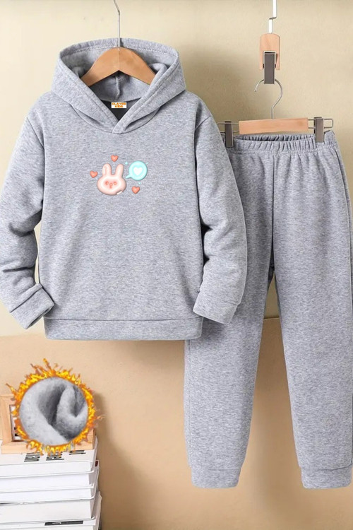 Sweetline Çocuk Gri Kapüşonlu Eşofman Takımı Şardonlu Kumaş Kışlık İkili Set - Kalpli Karikatür Baskılı