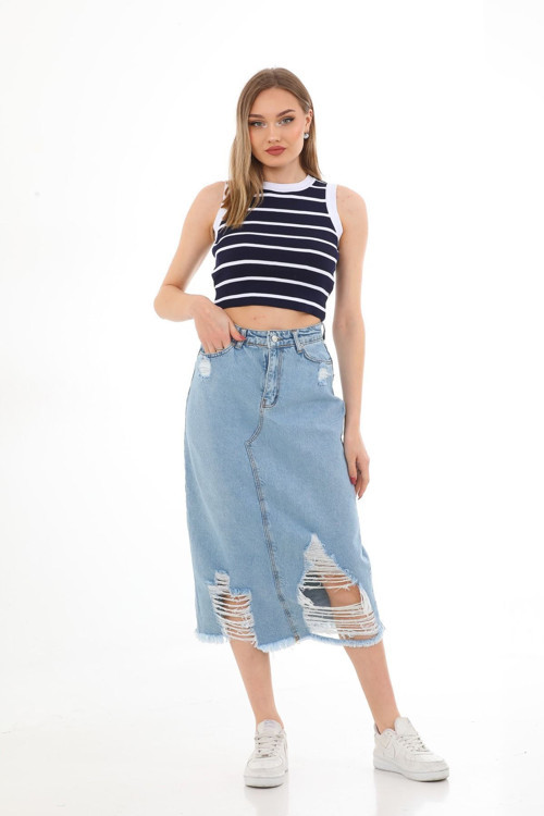 Yıpratmalı detayları ile modern ve şık bir dokunuş katarken, eteğinize dinamik bir hava katar
