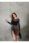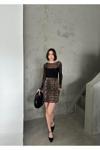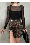 Kahverengi ve siyah renklerin uyumunu yansıtan leopar deseniyle dikkat çeken bu mini denim etek, genç ve dinamik tarzınızı yansıtmanız için idealdir