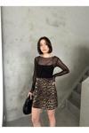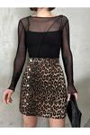 Swet Shop Jeans Kadın Kısa Önü Düğmeli Kahverengi Siyah Renk Leopar Desenli Likralı Mini Denim Etek Kahverengi L