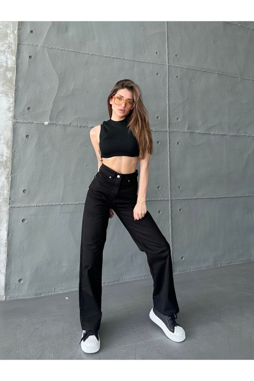 Günlük kullanım için ideal, rahat ve şık bir seçenek olan siyah yüksek bel wide leg geniş paça palazzo kot pantolon, her ortamda konforlu bir stil sunar