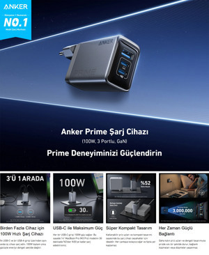 Anker Prime Şarj Cihazı (100W, 3 Portlu, Gan) - Gri - A2688 (Anker Türkiye Garantili)