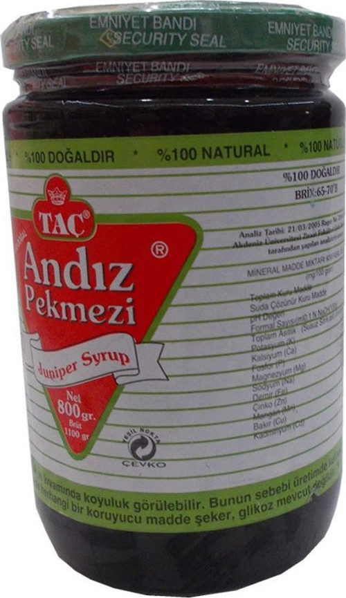 JUNİPER SYRUP - CAM KAVANOZ 800GR (±%5) Taç Andız Pekmezi Miktar - Birim - Ebat - Ağırlık - Ölçü: Taç Andız Pekmezi 800GR Taç Andız Pekmezi 800GR İzin Belge: Andız Pekmezi ürünü Öztaç Gıda Tarım Turizm ve Tic. LTD: ŞTİ. tarafından üretilmiştir. Kayıt no TR-07-K-011236 Taç Andız Pekmezi 800GR İçindekiler: Andız Pekmezi ürünü içerisinde; Andız gliği özü. Taç Andız Pekmezi 800GR Kullanımı: Andız Pekmezi kullanılışı; Günde iki çorba kaşığı alınması tavsiye edilir. Kahvaltıda, sade olarak, tahinle, yoğurtla veya su ilave ederek şurup şeklinde de tüketilebilir. Ürünün tadında burukluk ve kıvamında koyuluk görülebilir. Bunun sebebi üretiminde kullanılan andız gliği meyvesidir. Bu şekilde tüketilmesinde herhengi bir sakınca yoktur. İçeriğinde herhangi bir koruyucu madde şeker, glikoz mevcut değildir. DİR. Taç Andız Pekmezi 800GR Yan Etkileri: Andız Pekmezi Ürününün Bilinen yan etkisi bulunmamaktadır. Taç Andız Pekmezi 800GR Ürünü bitkisel üründür, kesinlikle ilaç değildir. Taç Andız Pekmezi 800GR Muhafaza ve Uyarı: