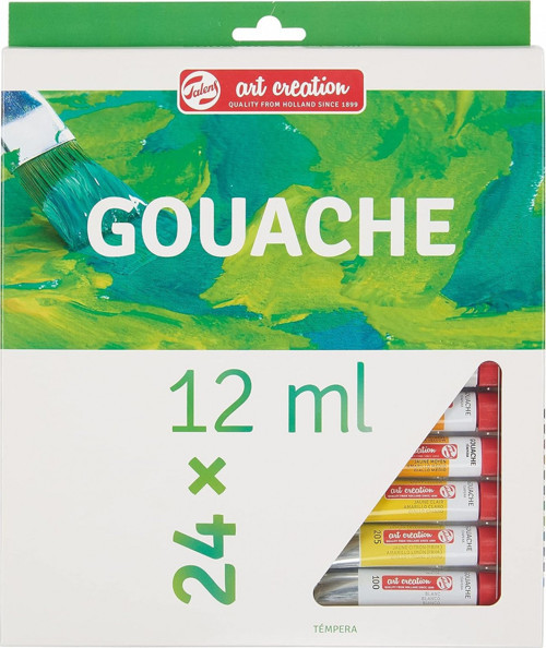 - Talens Art Creation guaj, su ile inceltilmis, çizgili kesmeden mat bölümleri boyayabilen opak bir boyadir.