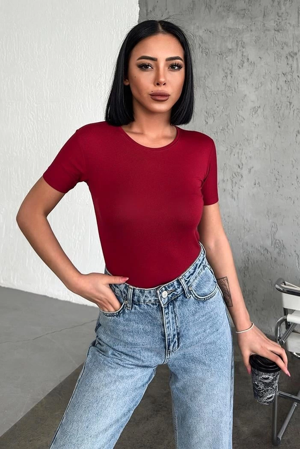 Rahat Ve Şık Kısa Kollu Bisiklet Yaka Likralı Viskon Penye Body Bordo - Bordo - L