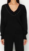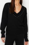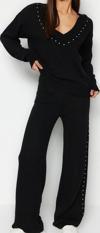 Tarz Kadın Modern Moda Normal Bel Boru Paça V Yaka Geniş Kalıp Taş Detaylı Triko Alt-Üst Takım