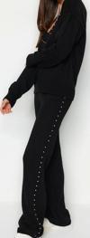 Ersefa Tarz Kadın Modern Moda Normal Bel Boru Paça V Yaka Geniş Kalıp Taş Detaylı Triko Alt-Üst Takım