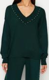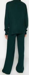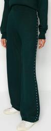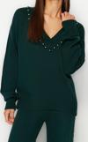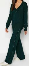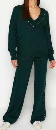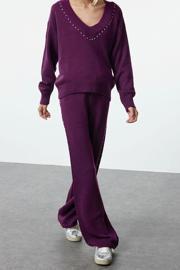 Ersefa Tarz Kadın Modern Moda Normal Bel Boru Paça V Yaka Geniş Kalıp Taş Detaylı Triko Alt-Üst Takım