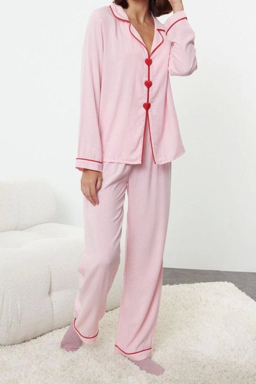 Tarz Rahat Uzun Kollu Boru Paça Kalpli Biyeli Viskon Dokuma Pijama Takımı