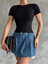 İntive lingerie-innocent&attractive Taş Baskılı/Yapıştırma Kaşkorse Siyah Bisiklet Yaka Kısa Kollu Şık Bluz/Tişört