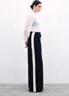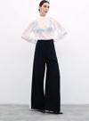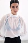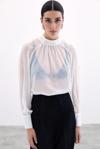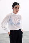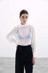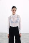 Dik yaka, geniş manşetli kol, arka yaka düğmeli, salaş, ön birleşik taş aksesuarlı transparan bluz.