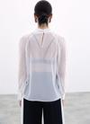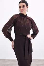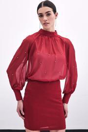 Dik yaka, geniş manşetli kol, arka yaka düğmeli, salaş, ön birleşik taş aksesuarlı transparan bluz.