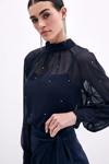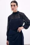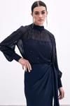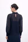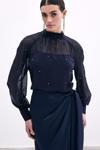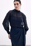 Dik yaka, geniş manşetli kol, arka yaka düğmeli, salaş, ön birleşik taş aksesuarlı transparan bluz.
