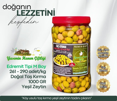 Köy usulü taş kırma yöntemiyle özenle işlenmiş, doğal tat ve gevreklik sunan Edremit tipi yeşil zeytinler. Büyük L boy, 261–290 adet/kg, net 1 kg’lık ambalajıyla sofranıza sağlık ve lezzeti taşıyor. Katkısız, doğal ve geleneksel yöntemlerle hazırlanmış bu zeytinler kahvaltılarınızı ve mezelerinizi daha da zenginleştirecek.