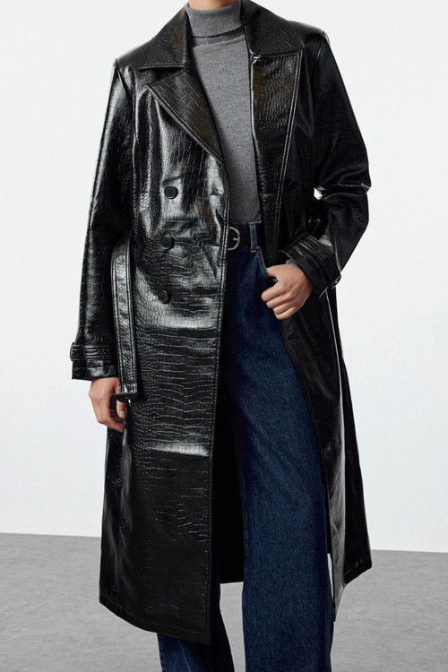 - - Astar Durumu:Astarlı - Kalıp:Regular - Kumaş Tipi:Suni Deri - Renk:Siyah - Yaka Tipi:Erkek Yaka - Desen:Düz - Ürün Tipi:Düz - Kol Tipi:Standart Kol - Kol Boyu:Uzun - Kalınlık:İnce - Persona:Fashion Forward - Kapama Şekli:Kruvaze - Boy:Uzun - Siluet:Regular - Sürdürülebilirlik Detayı:Hayır - Ortam:Casual/Günlük - Kemer/Kuşak Durumu:Kemerli - Materyal Bileşeni:100% Poliüretan - Yıkama Talimatı:T33 - Yaş:Tüm Yaş Grupları -