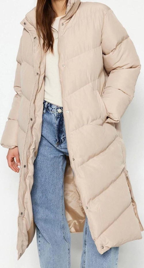 Ersefa Tasarım Düz Astarlı Yaka Uzun Regular Dik Kadın Yandan Fermuar Detaylı Su İtici Uzun Şişme Mont