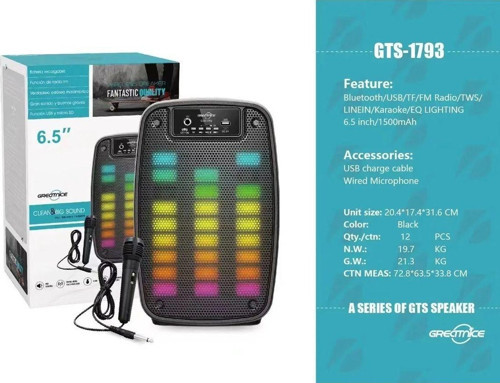 6,5” KABLOSUZ HOPARLÖR IŞIKLI HOPARLÖR GTS 1793 + MİKROFON + KONTROL"Hayatın müziğini sınırsız ve kablo olmadan dinleyin. Kablosuz hoparlörümüzle her anı bir partiye dönüştürün. Günlerinizi gülümsemeler ve ritimle doldurun!"6,5 inç LED Bluetooth hoparlör, mükemmel ses, Bluetooth üzerinden 10 m'ye kadar tepki mesafesi. USB girişi, FM radyo, MIC girişi gibi tüm fonksiyonları içerir. Arkasında sap görevi gören bir sap bulunmaktadır. Hoparlörde karaoke işlevi gören bir mikrofon, uzaktan kumanda ve v8 şarj kablosu bulunur.Siyah renkUygun olanlar: Açık ve kapalı eğlenceİşlev: USB/TF/FM/TWS/mikrofon/bluetoothHoparlör Boyutu/Teknik Özellikler/Birim: 6,5 inç x 10W x 1 adet,yükseklik 32 cm x 20 cm genişlikPil: 1200mAh şarj edilebilir lityum pil.Aksesuarlar: USB kablosu x 1 birim, kablolu mikrofon x 1 birim, denetleyici x 1 birim.Şarj süresi: 3 saatBluetooth