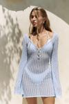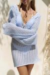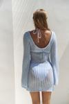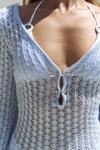 Uzun kollu, göğüs derin v yaka bağlama detaylı, mini triko elbise. Kolalrı geniş kesim ve dokulu kumaş. Astarsız.