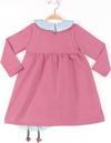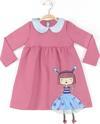 Bebe yakalı, gülkurusu kumaş üzerine etekleri kız deseni baskılı elbise. Desendeki kızın etekleri tülden yapılmıştır ve ayakları 3 boyutludur.